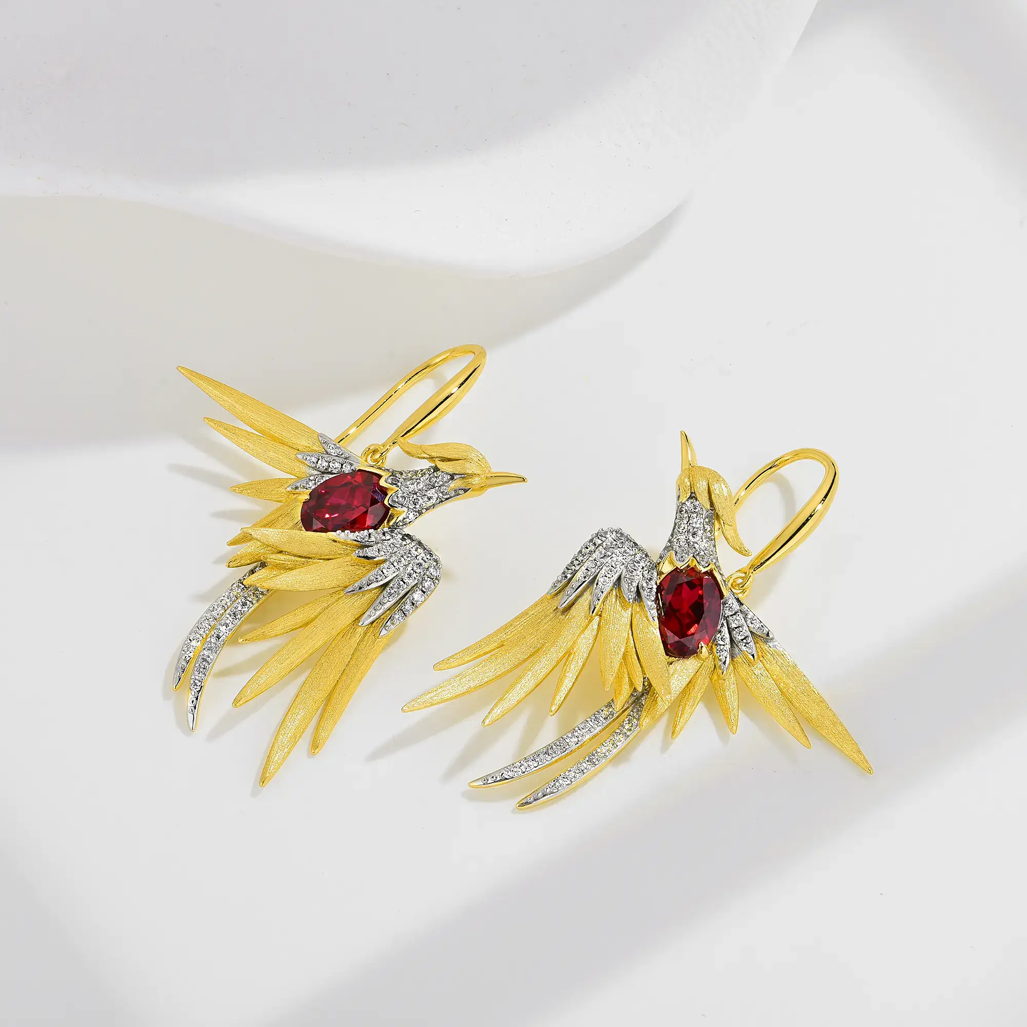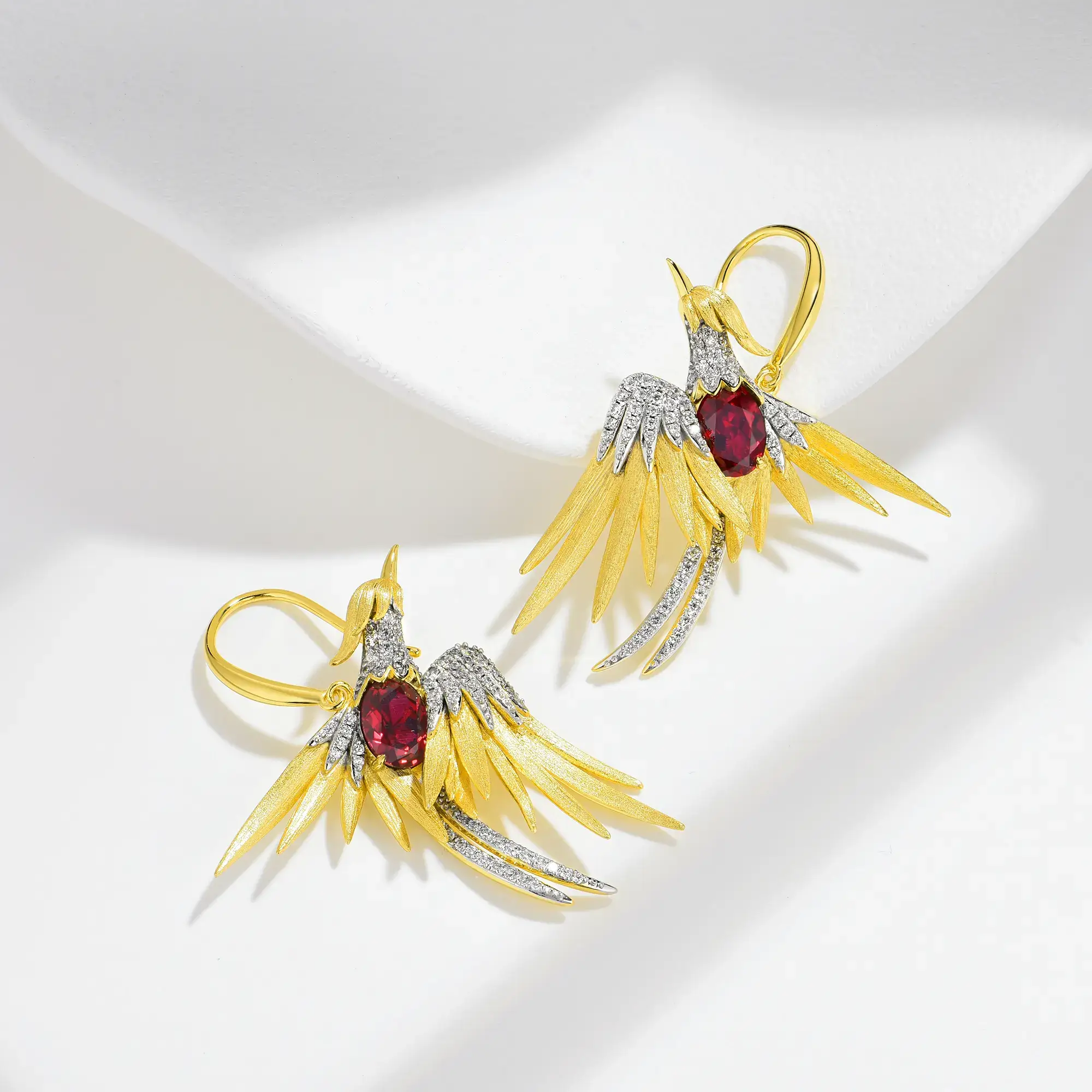 Handmade Brush Jewelry Surface Texturing Lab Grown Oval Ruby Real 925 Silver Drop Stud Earrings Fashionable Animal Big Bird Gold Plated Jewelry for Women Gifts