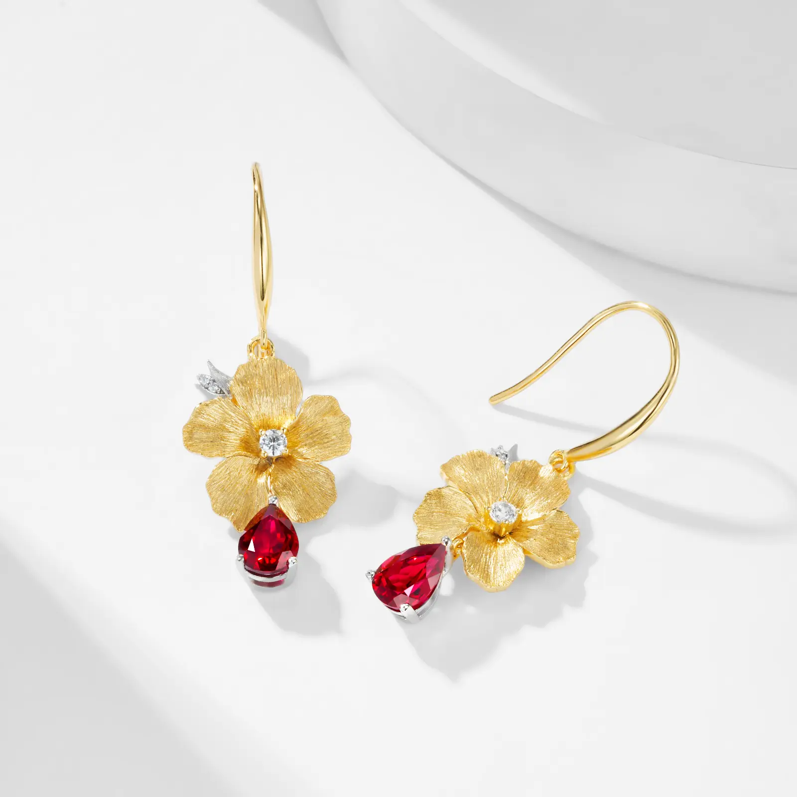 High-Grade Gold Plated Texture Flower Petal Lab Grown Pear Ruby Natural Gemstone Long Dangle Earrings for Women Hypoallergenic 925 Sterling Silver Jewelry