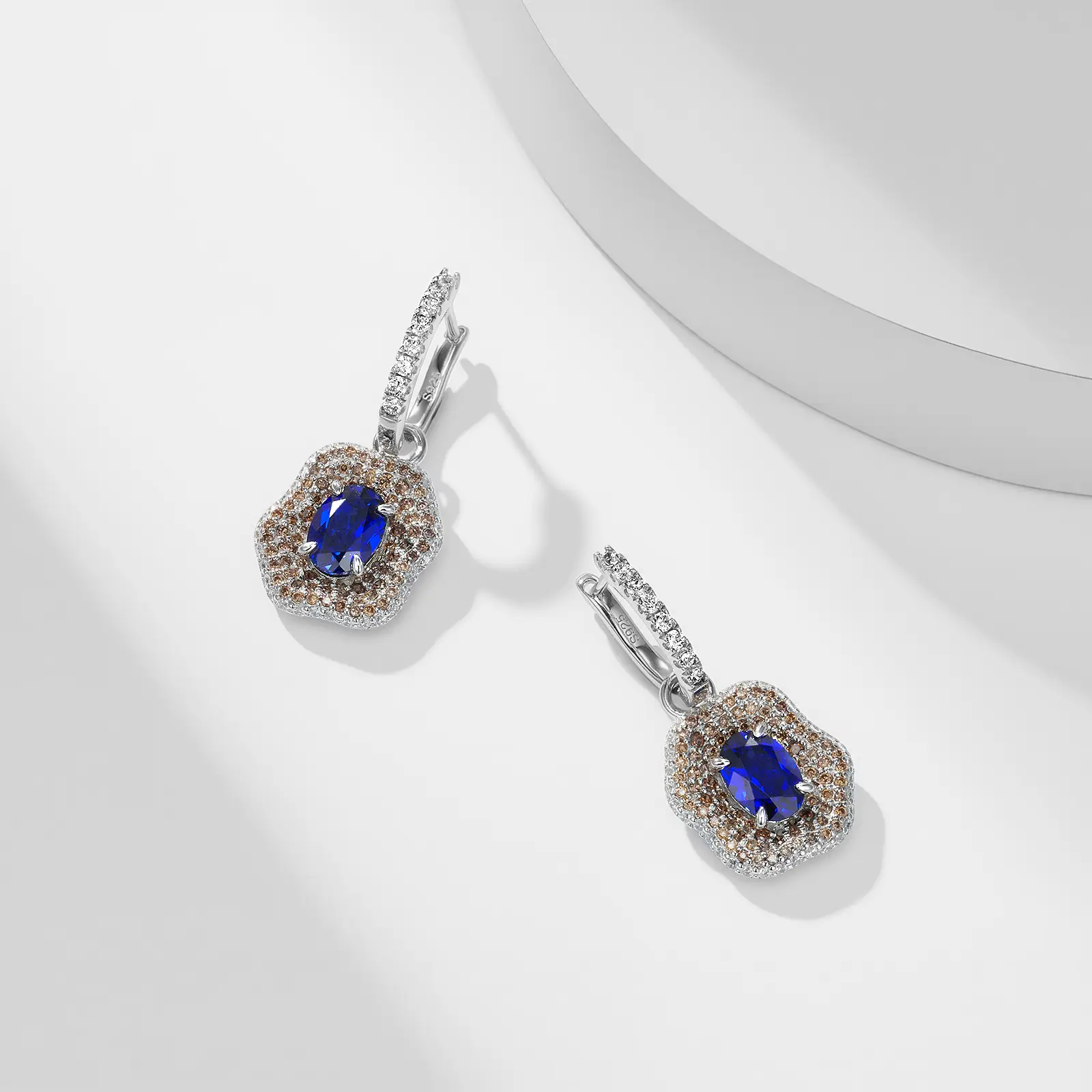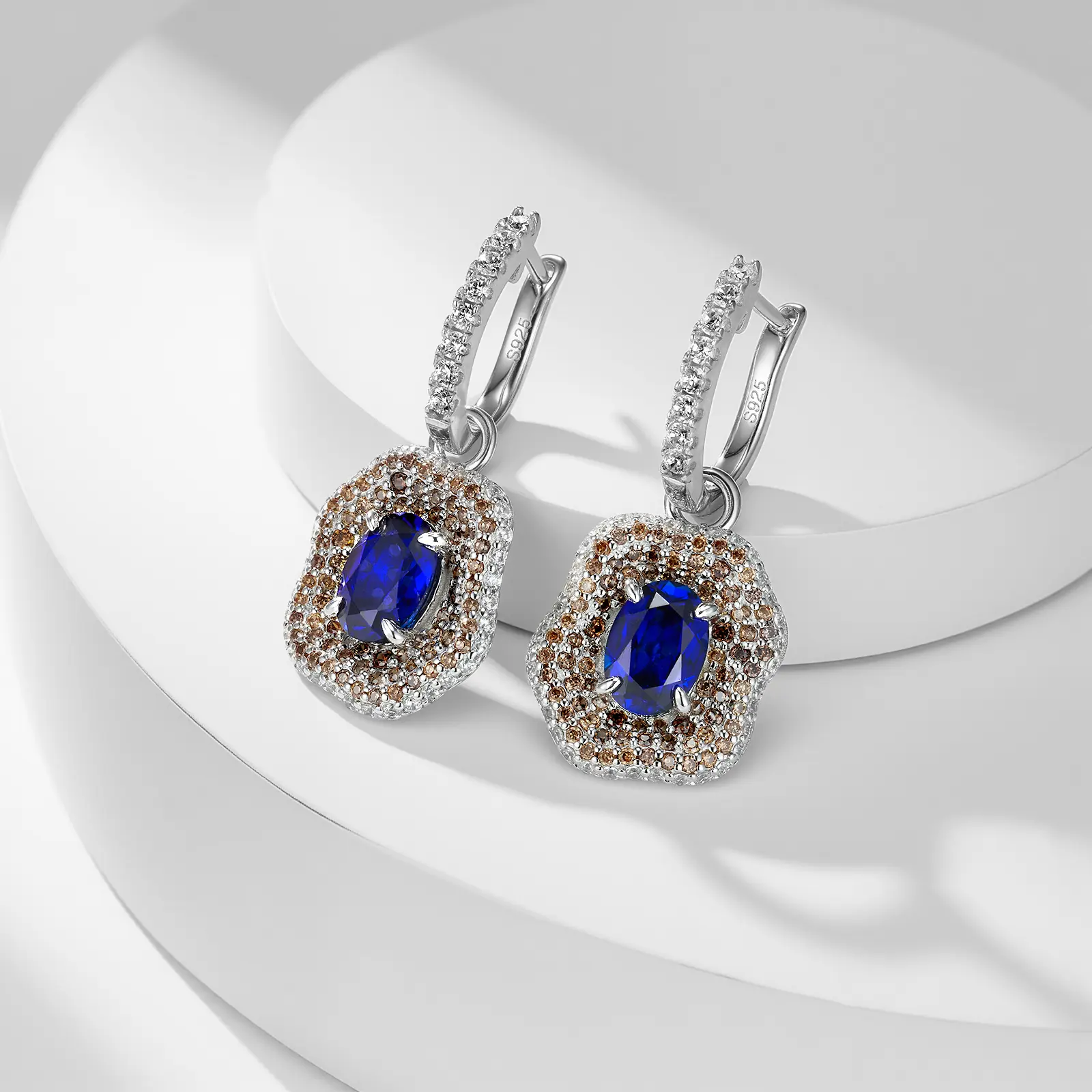 Lab Grown Blue Sapphire Brown Gemstone Dangling Drop Solid Silver Earrings for Women Mother Elegant Engagement Jewelry