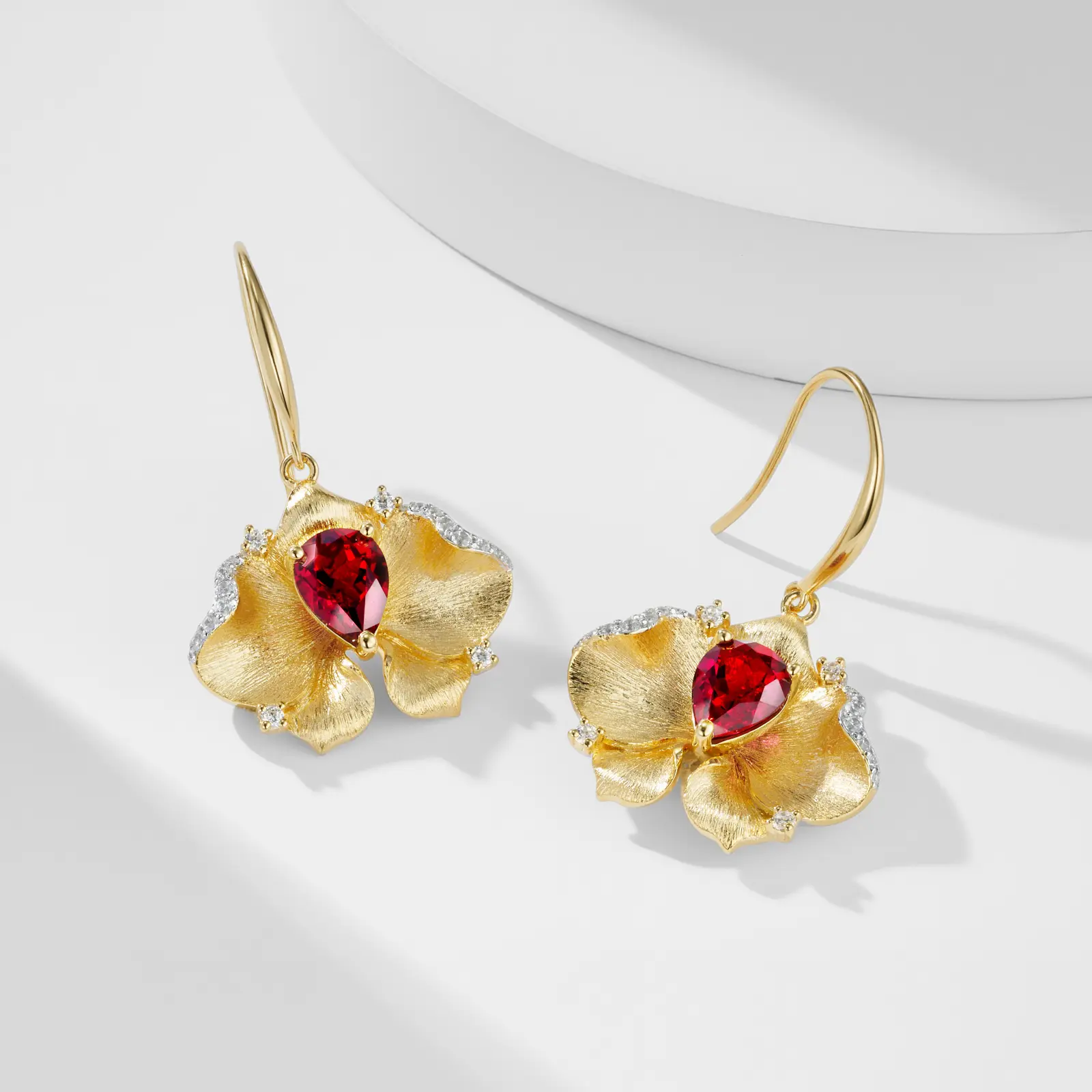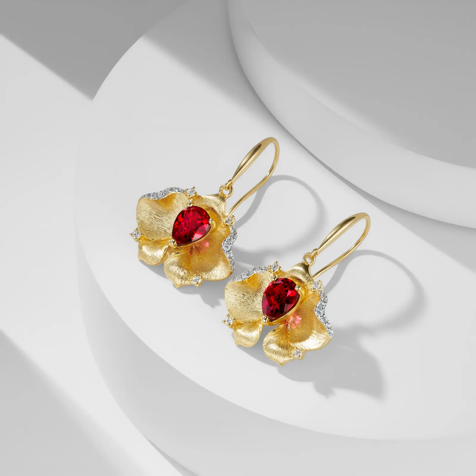 Lab Grown Ruby Petal Texture Flower Gold Vermeil 925 Sterling Silver Unique Elegant Big Dangle Earrings for Women Bride Wedding Exaggerated Charm Jewelry