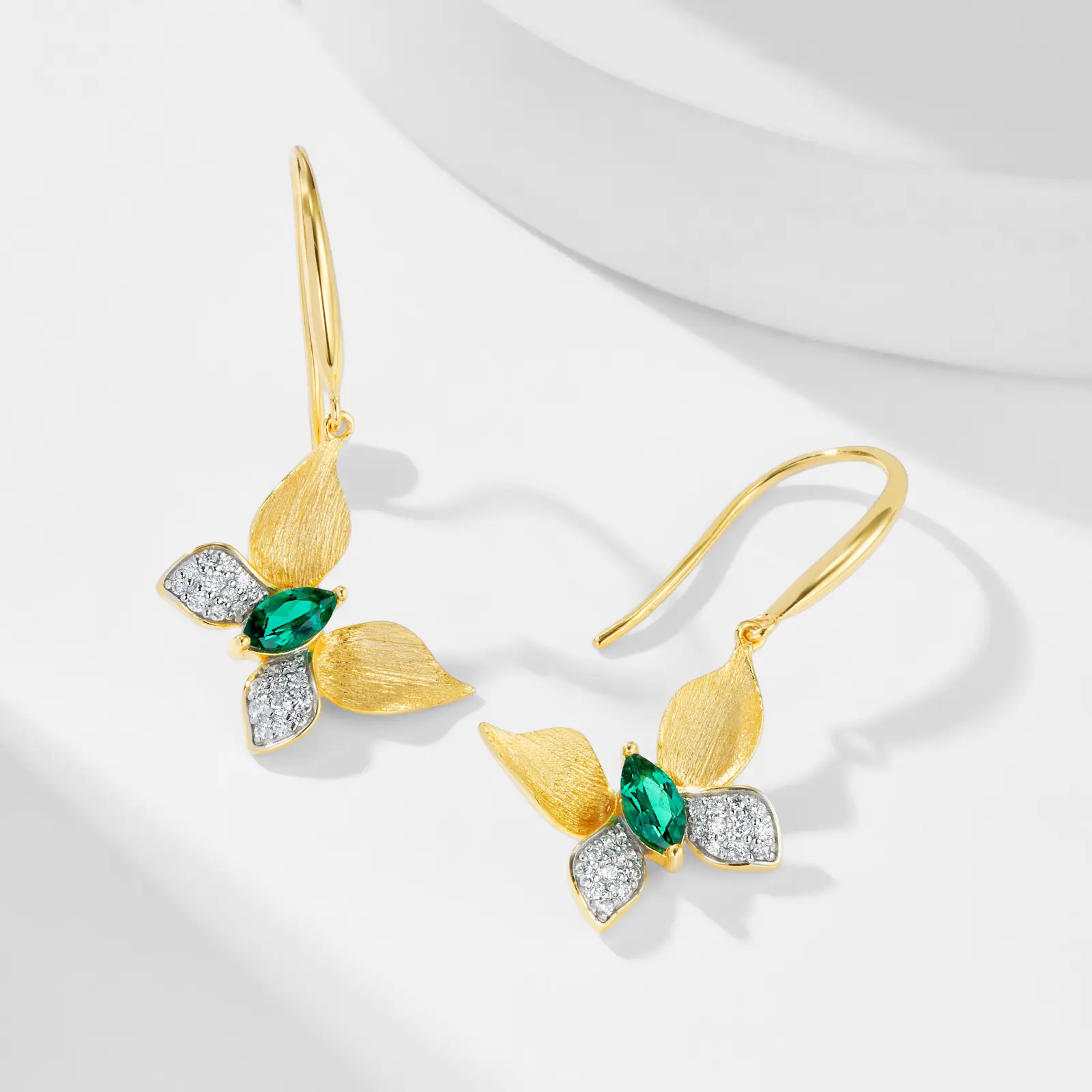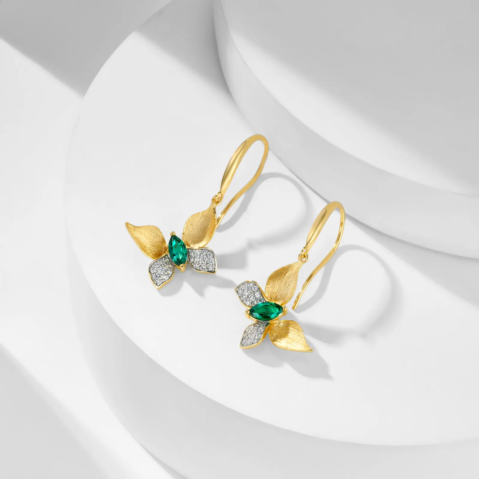 Luxury Gemstone Diamond Lab Grown Emerald S925 Silver Gold Butterfly New Brushed Finish Dangle Earrings for Girls Women Customized Fancy Jewelry