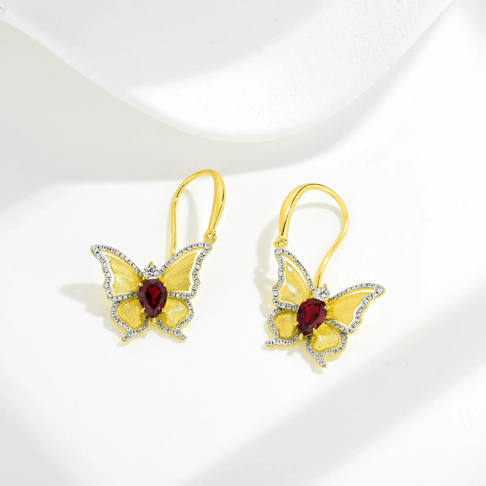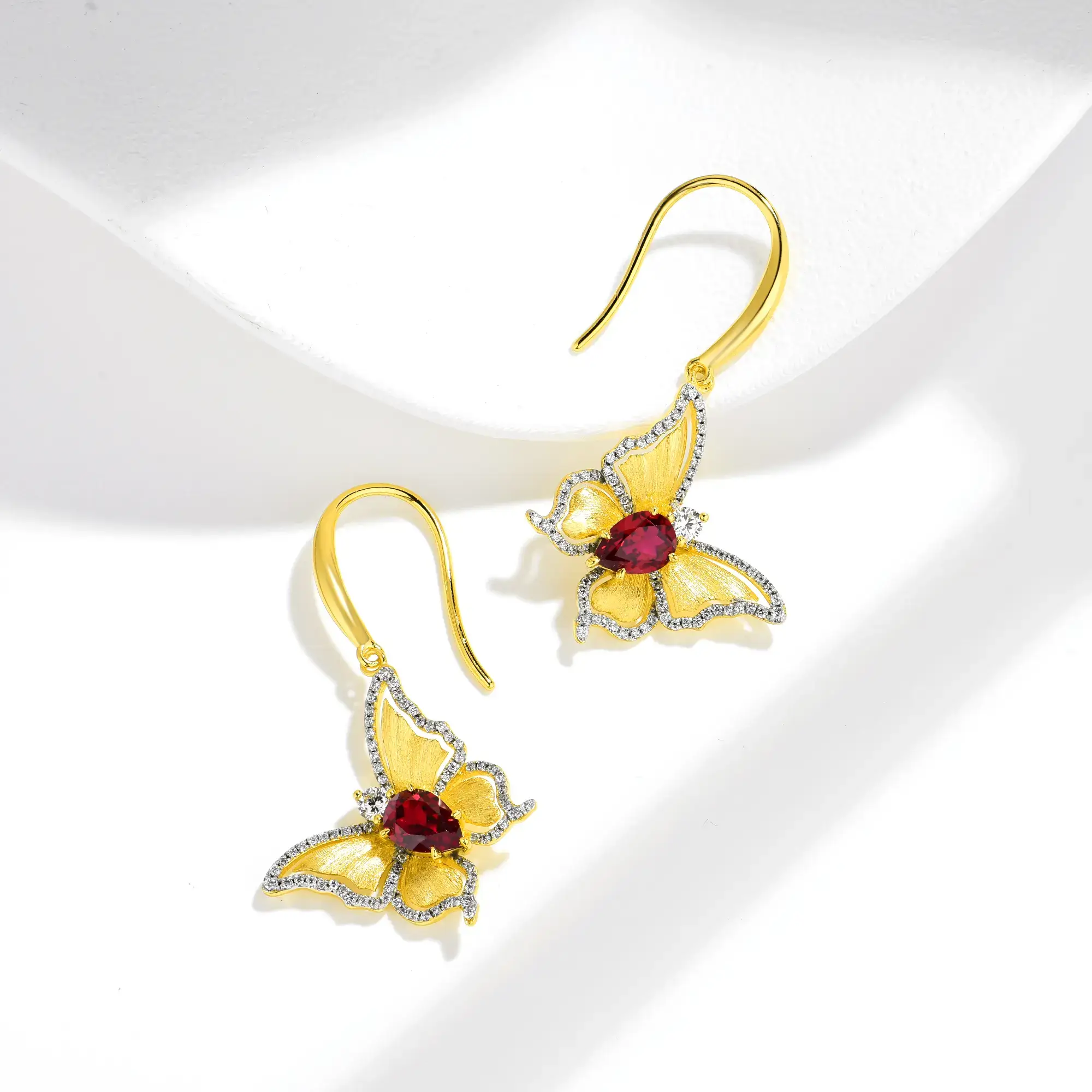 Manufacturer Wholesale Luxury Hypoallergenic S925 Silver Butterfly Pattern Lab Grown Ruby Birthstone Fashion Dangle Earrings for Women Temperament Jewelry
