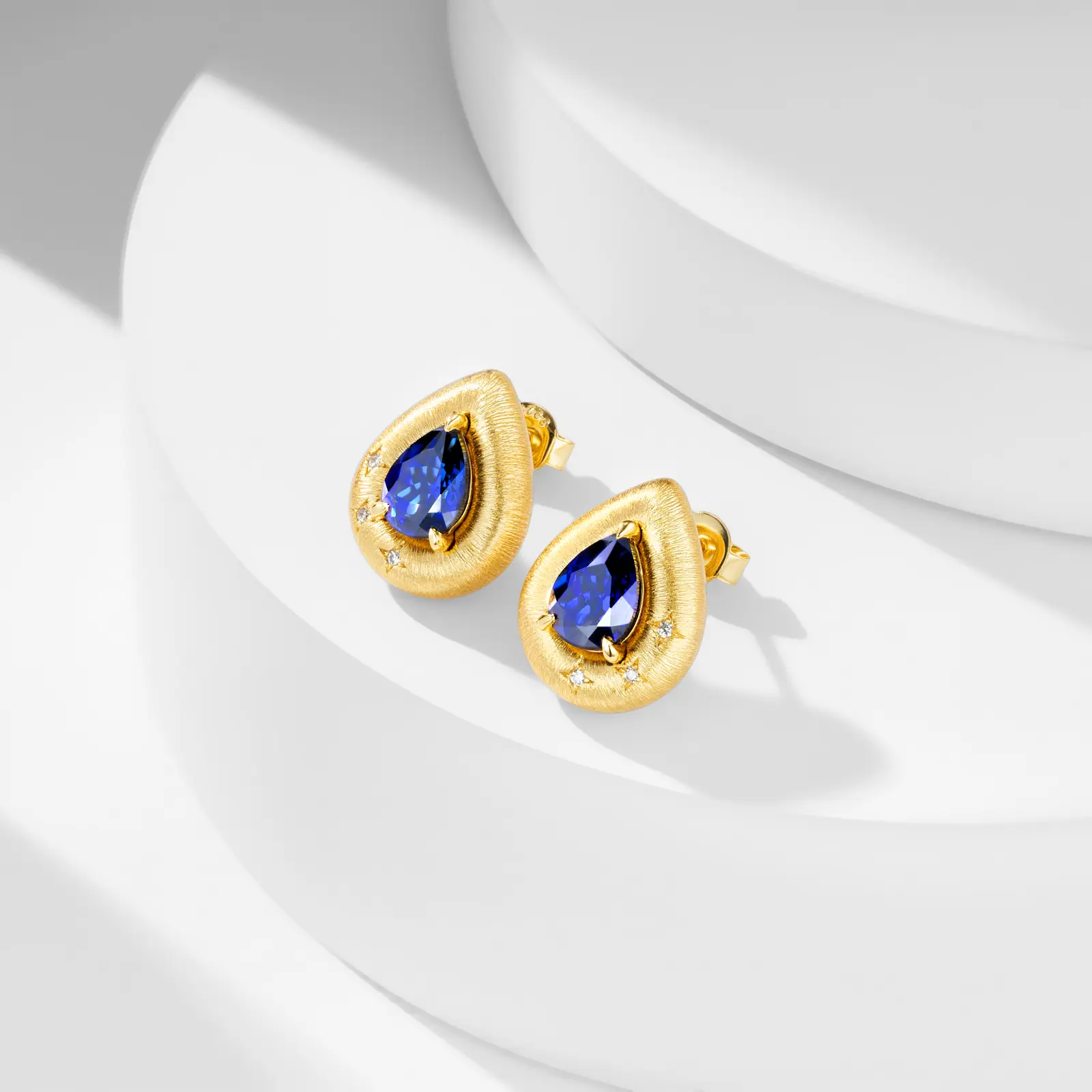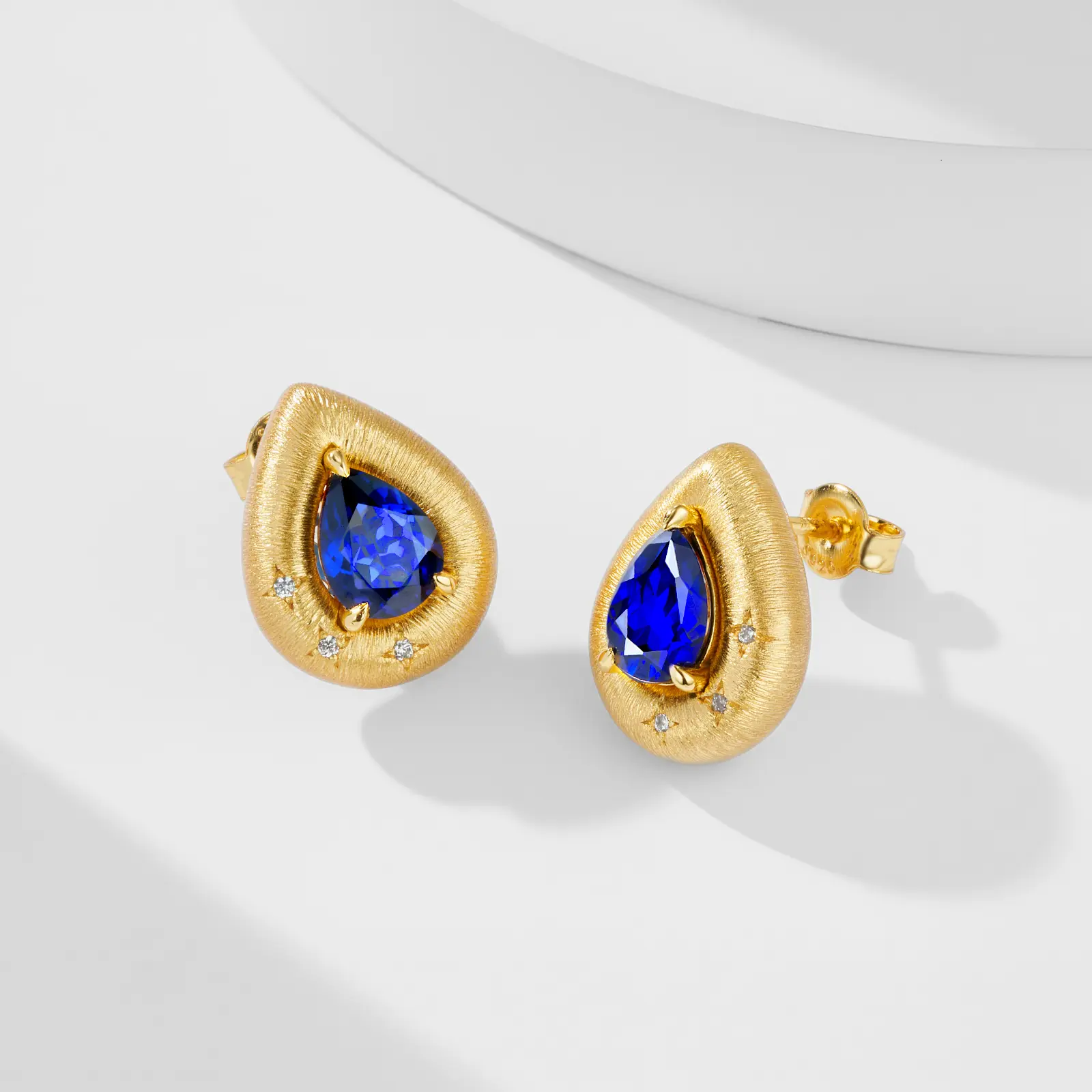 Yellow 18K Real Gold Lab Grown Sapphire Stone Stud Earrings Brushing Finish Silver Precious Metal for Mother Wife Classic Water Drop Fine Jewelry