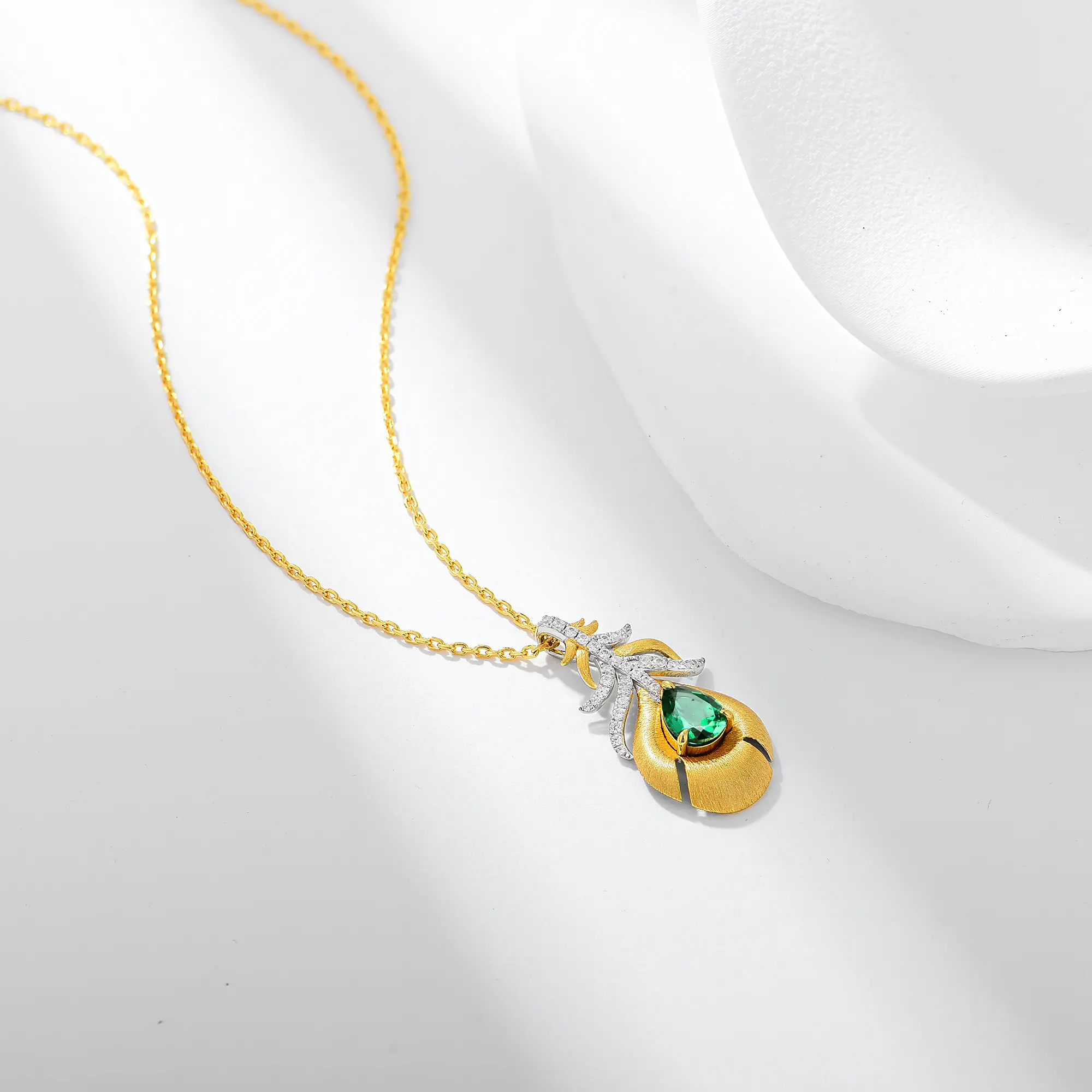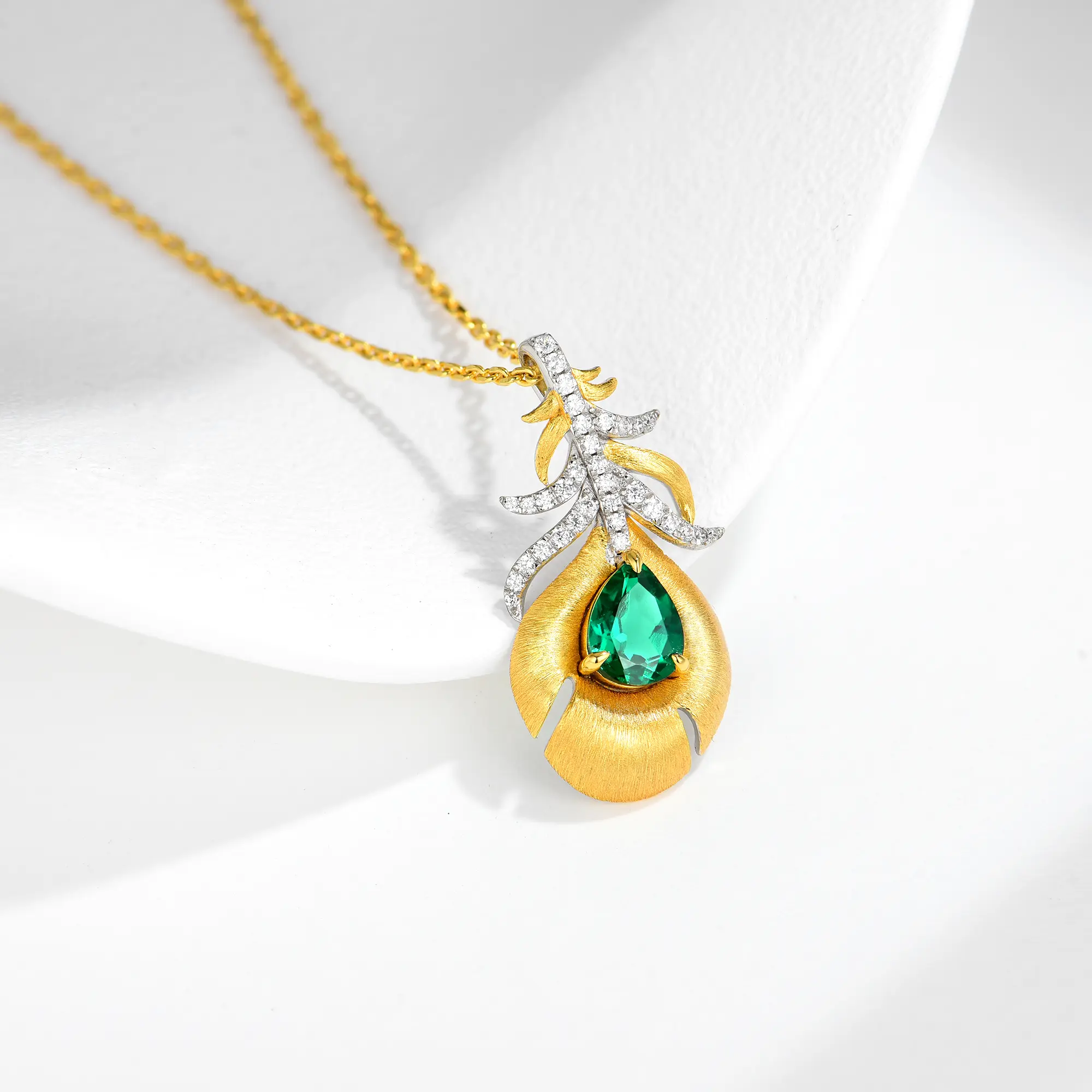 Home / Products / Pendant Necklace / Factory Wholesale 100% Sterling Silver Lab Grown Green Emerald Shiny Crystal Golden Peacock Feather Pendant Necklace for Women Customizied Jewelry Accessories