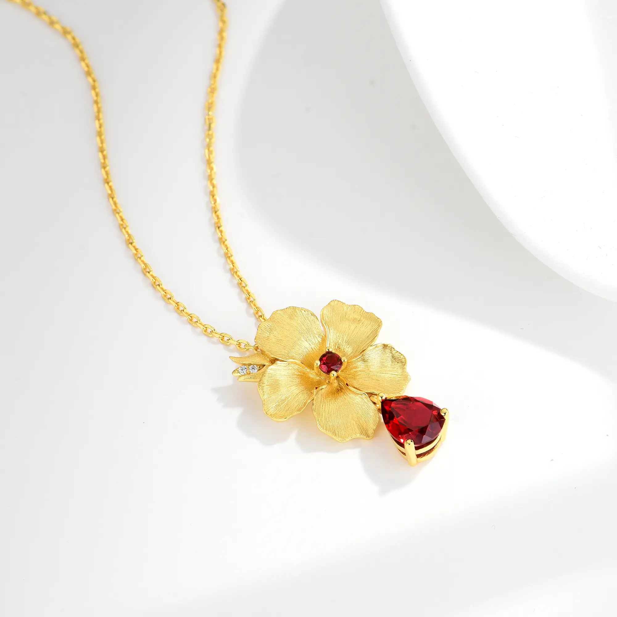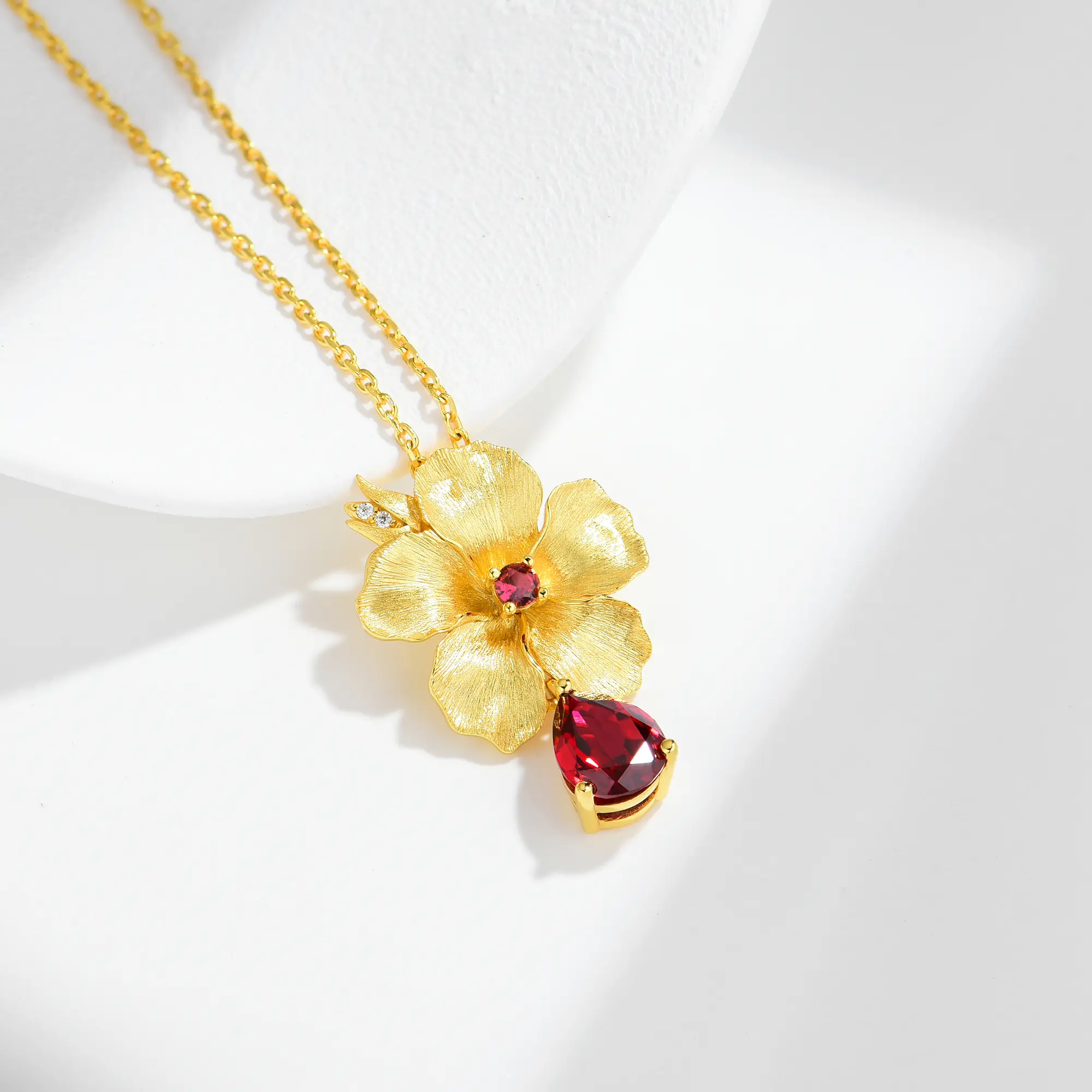 Natural Lab Simulated Pear Ruby Luster Flower Brushed Finish Golden New Arrival Dangle Engagement Pendant Necklace for Women Wholesale 925 Sterling Silver Gemstone Jewelry