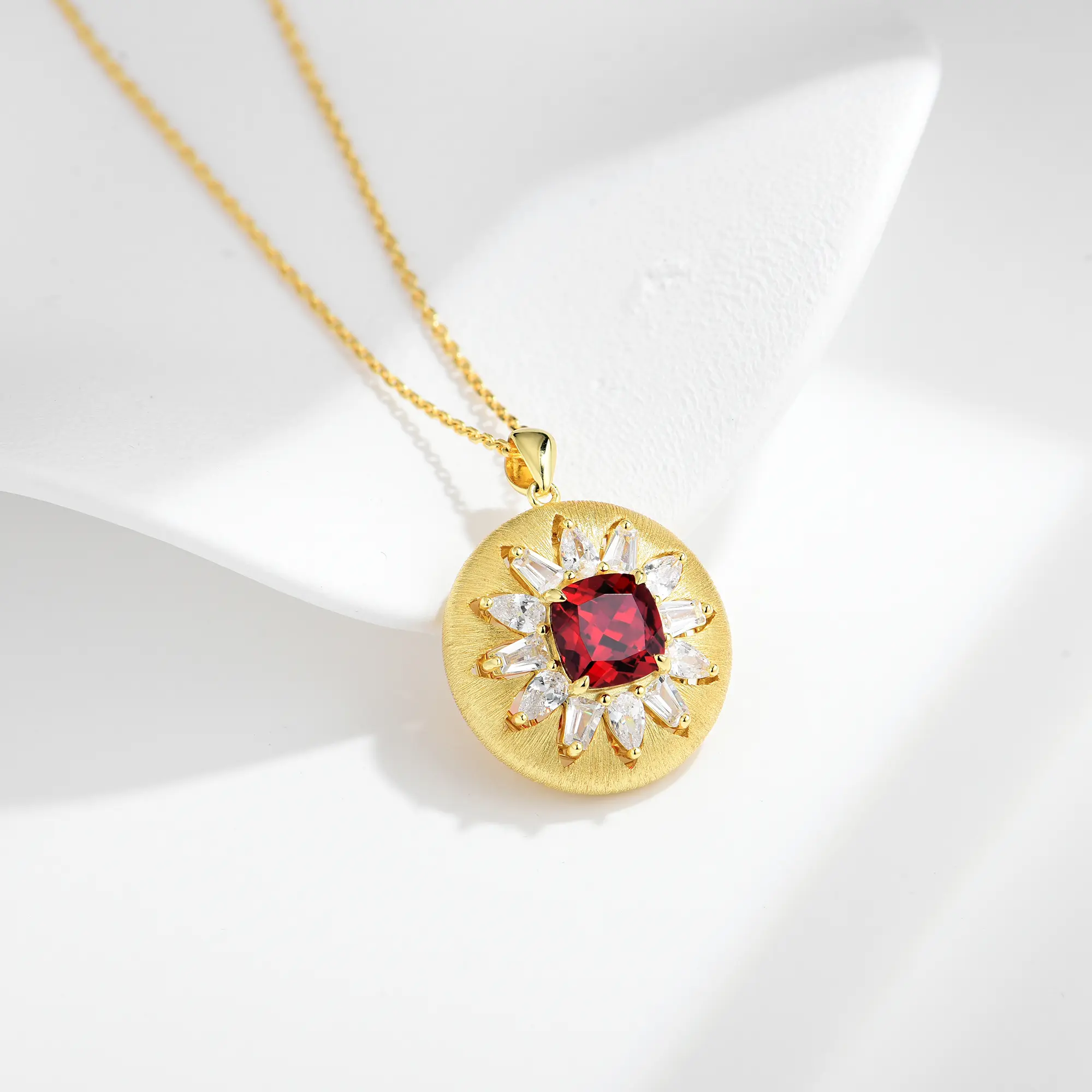 Natural Pigeon Blood Red Gem Crystal Lab Created Cushion Ruby Round Elegant Lastest Real Gold Pendant Necklace for Women Wholesale Modern 925 Sterling Silver Stunning Jewelry