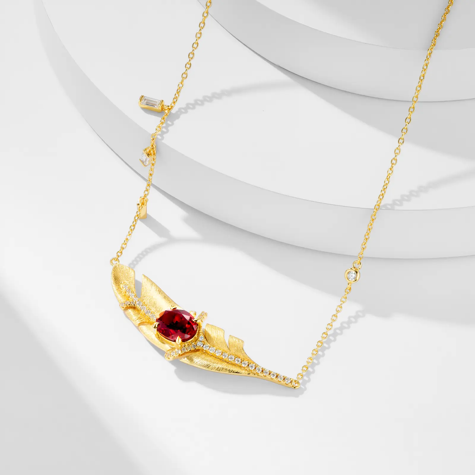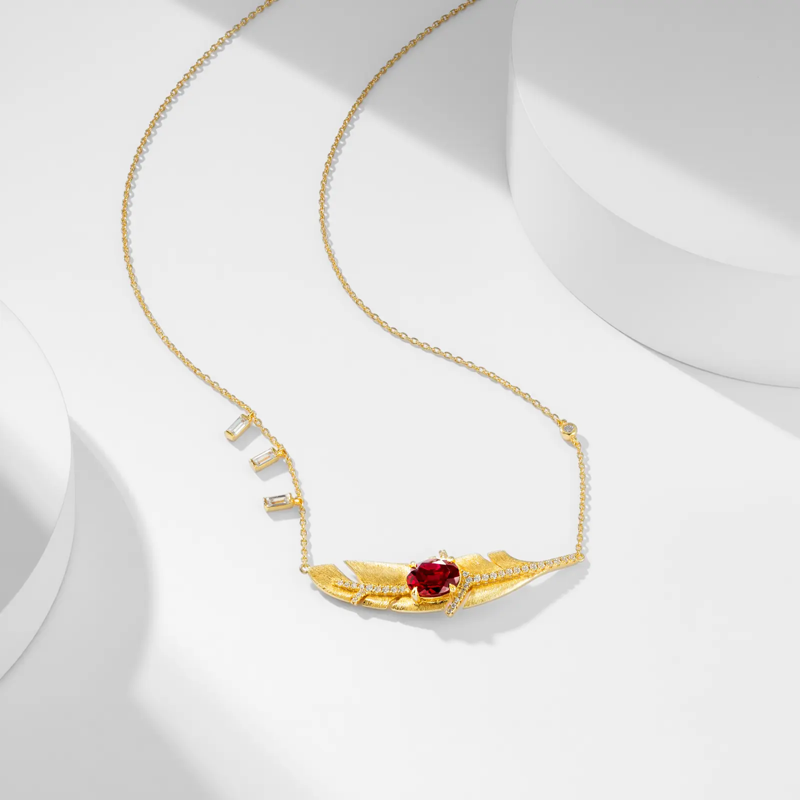 Original Elegant Feather Design 18K Golden Pigeon Blood Ruby Lab Grown Red Gemstone 925 Pendant Necklace for Women Bride Wedding Engagement Ceremony Custom Fine Jewelry