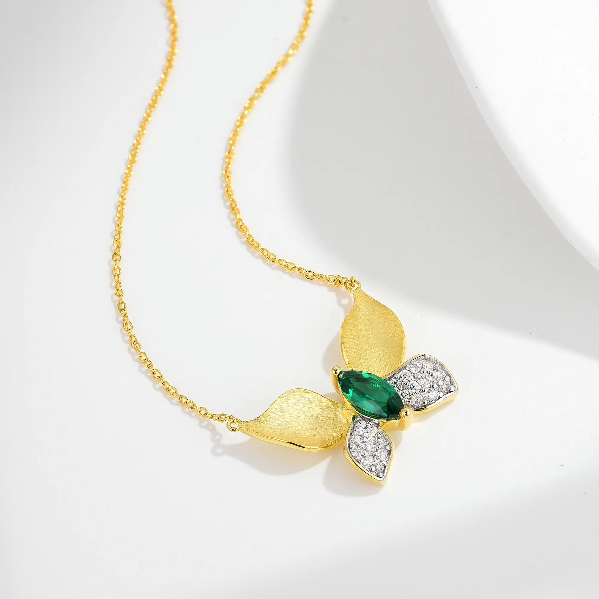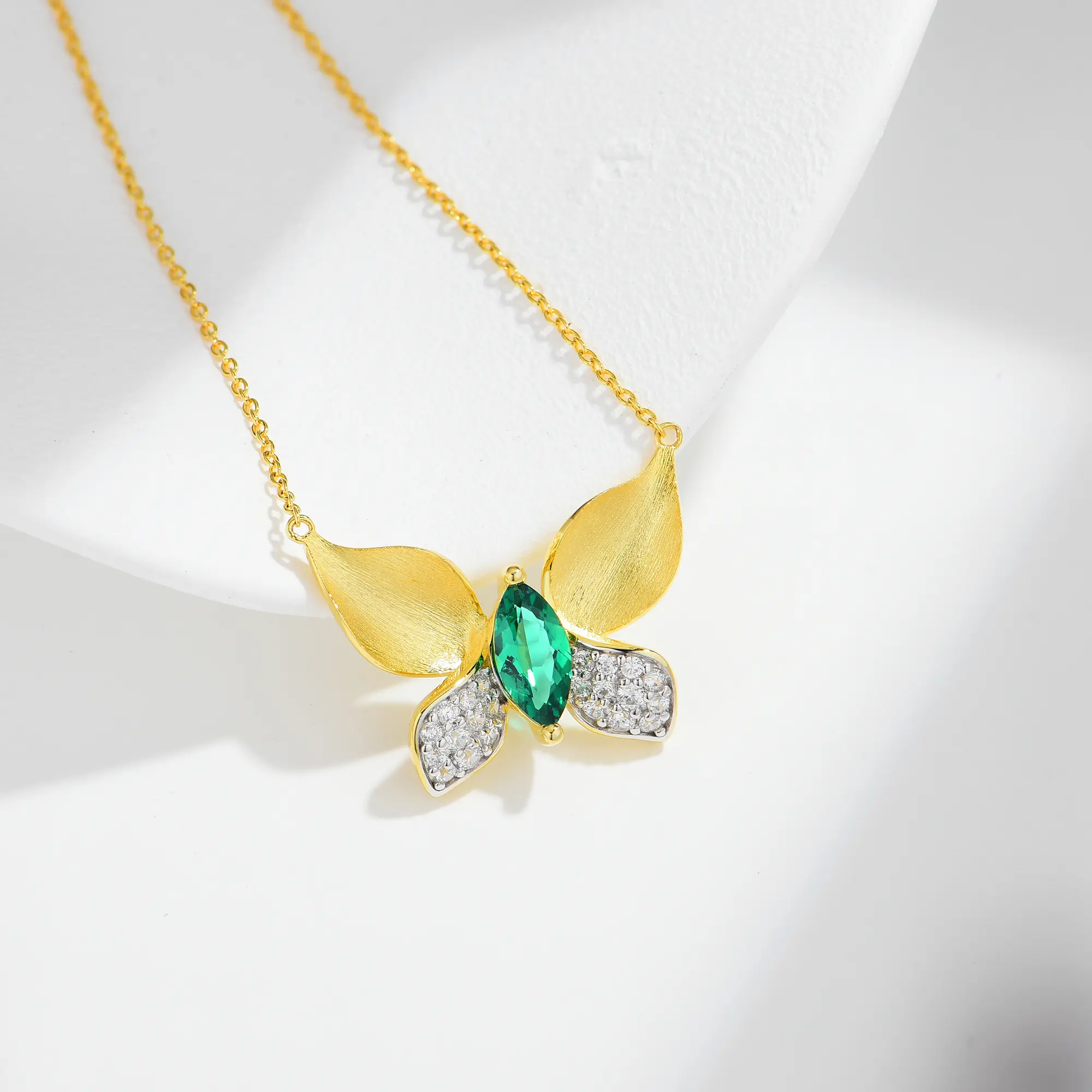 Home / Products / Pendant Necklace / Women Pretty Dainty Butterfly Brushed Finish Golden Texture Lab Grown Emerald Crystals Pendant 925 Silver Hypoallergenic Glossy Fashion Necklace Jewelry