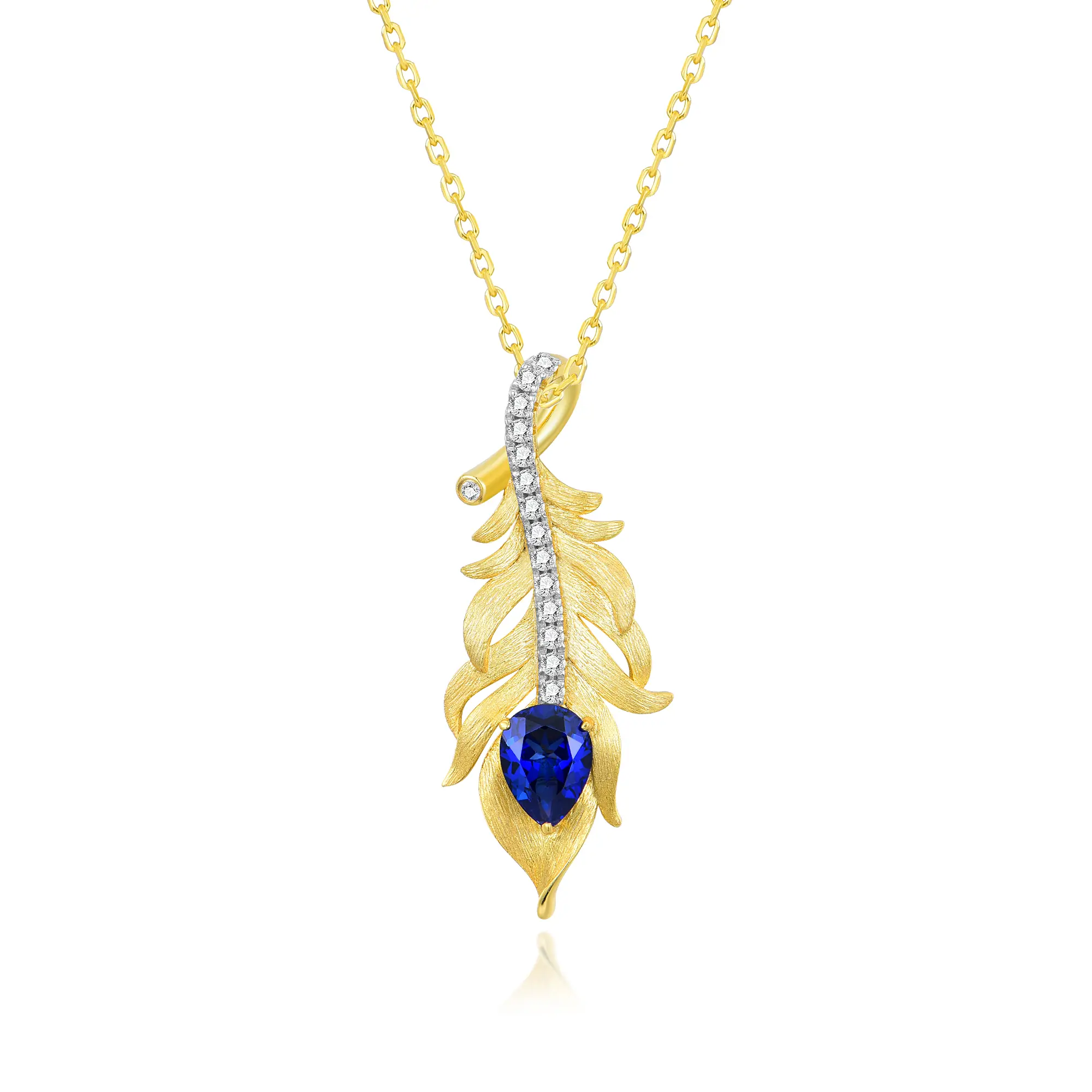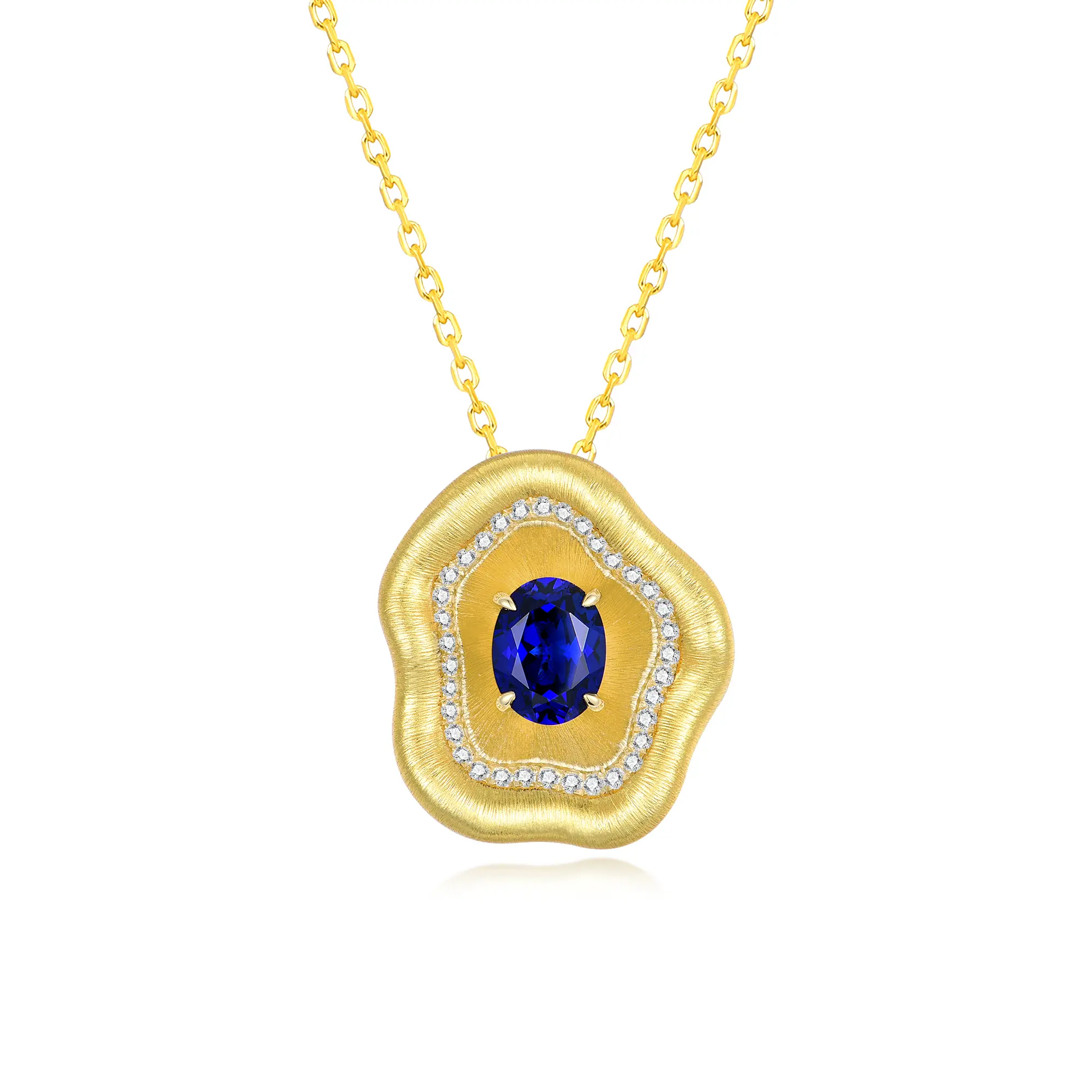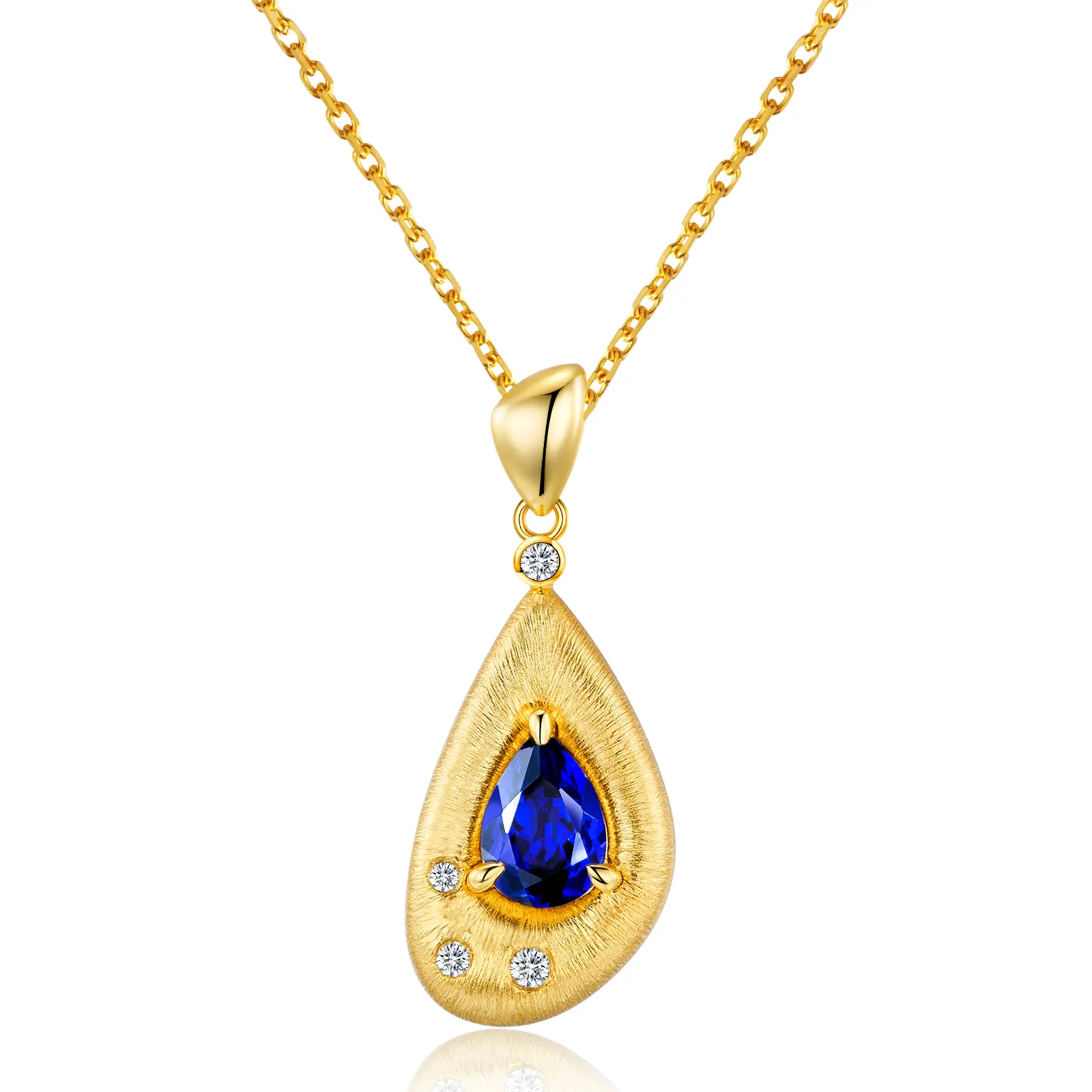 Gold Pendant Teardrop Blue Sapphire Lab Grown Corundum Stone Unique Geometric Design Timeless Luxury Style s925 Silver Necklace Jewelry for Women Lady Love Hot Sale Gifts